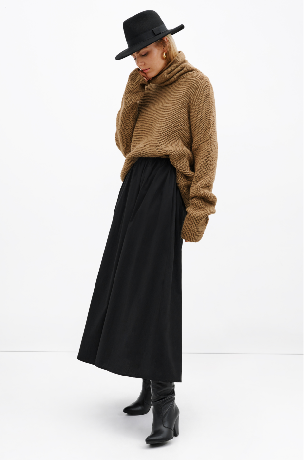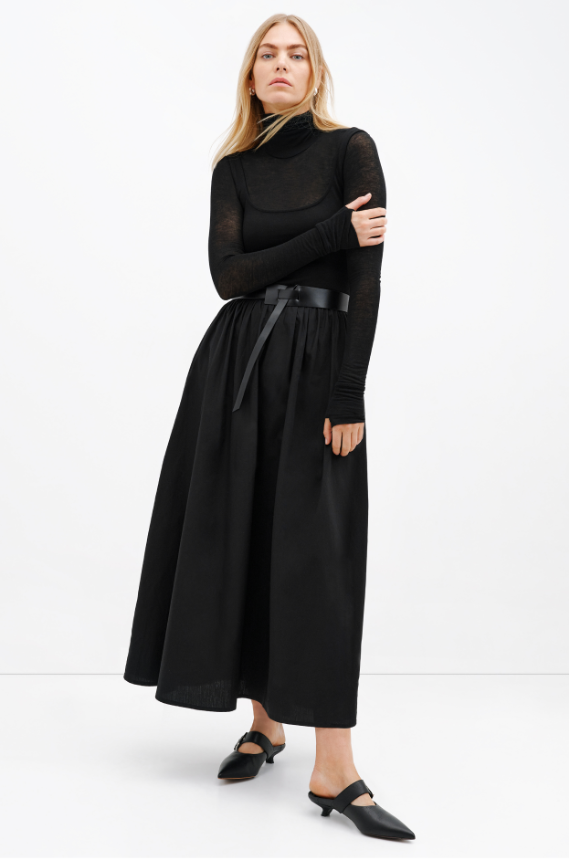 Clara’s elegance has an artist’s touch when layered with the Eloise Turtleneck, whose sheer texture adds an interesting dimension to Clara’s low scoop neckline. A striking look for afternoons at The Met or The Guggenheim.