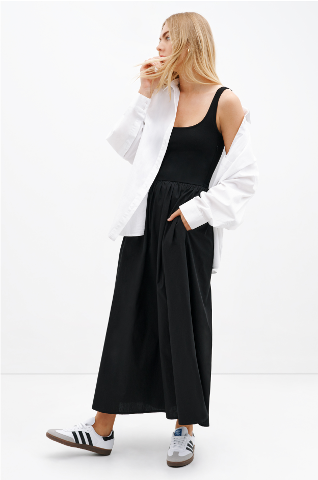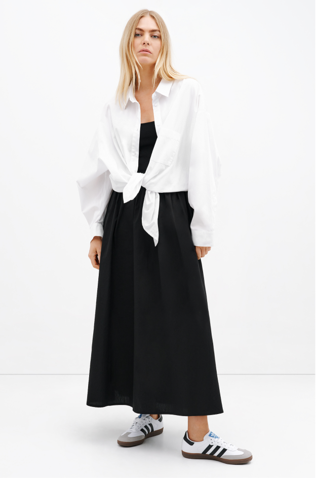 Take the Boyfriend Shirt with you through a leisurely afternoon in Soho. Wear her over the Clara Dress, tied at the front, for a relaxed yet elevated look while you explore the boutiques, pause for an afternoon coffee, and admire the art on the streets.