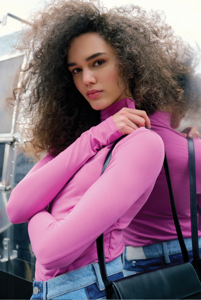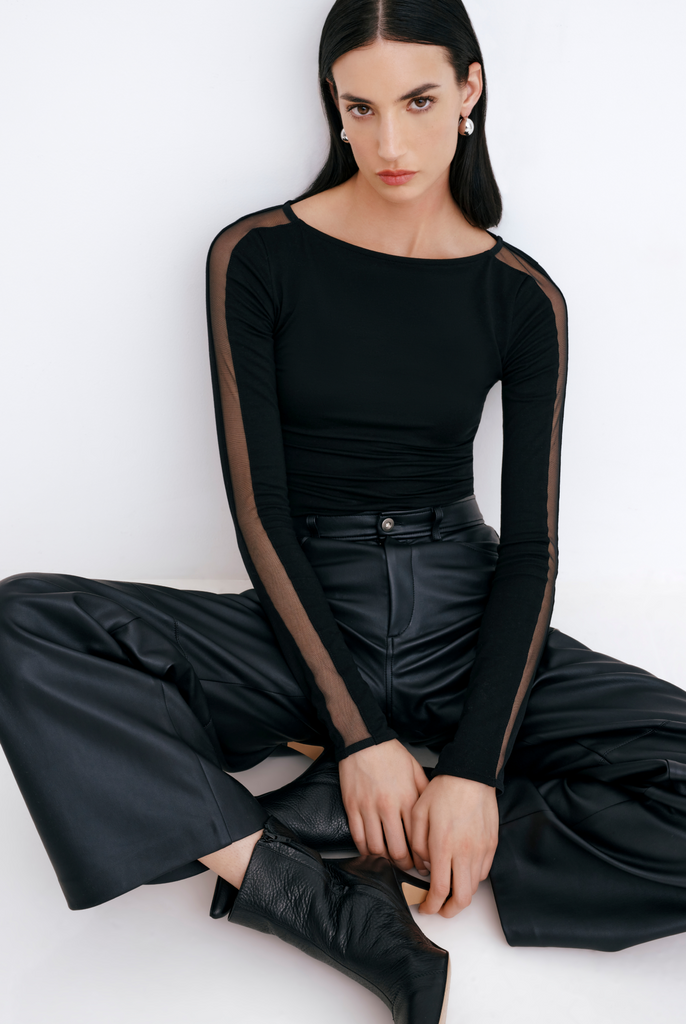 FW24 is rich with contrast. Clean-tailored cuts are draped with modern ease. Some designs are sharpened by stark angles and diagonal lines, while others are softened by ruffled purl-stitching and curved seams. Opaque and sheer fabrics strategically blend, playing with negative space or tricking the eye into seeing high necklines as off-shoulder silhouettes. Each design stays true to our core collection of sustainable European fabrics, offering endless wearability alongside striking originality.