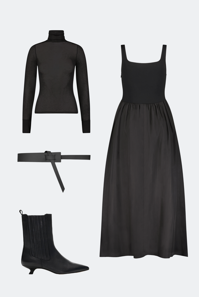 The key to making Clara last through the coldest months? Smart layering. When layering underneath, stick with clean, close-fitting pieces, as this helps maintain the silhouette. If too bulky, it'll add less-than-desirable volume or cause the fabric to bunch up. We love a slim turtleneck or a long-sleeve base, a long wool coat on top, an infinity scarf on extra-chilly days, and boots to slide into when moving from one festivity to the next.