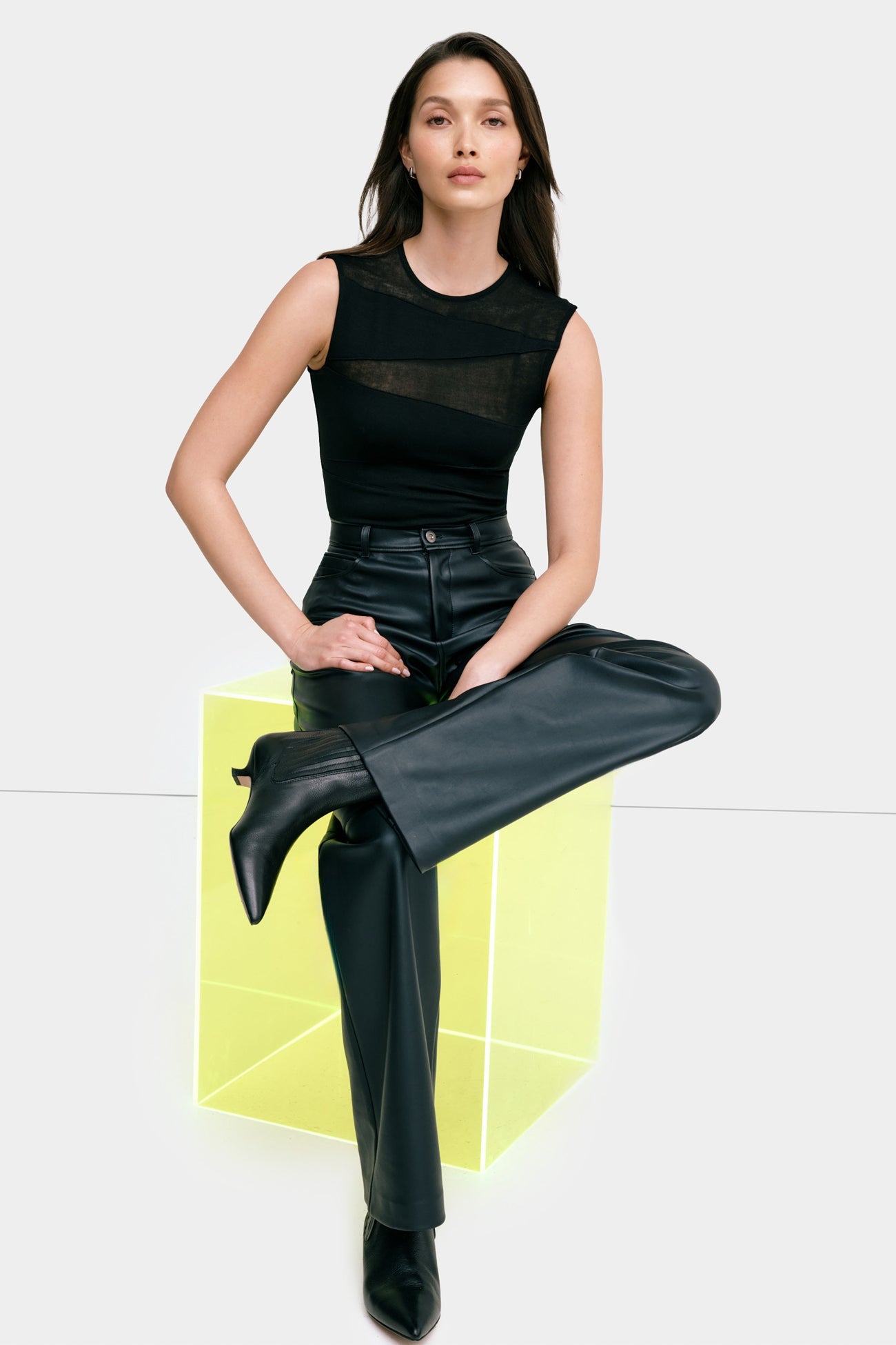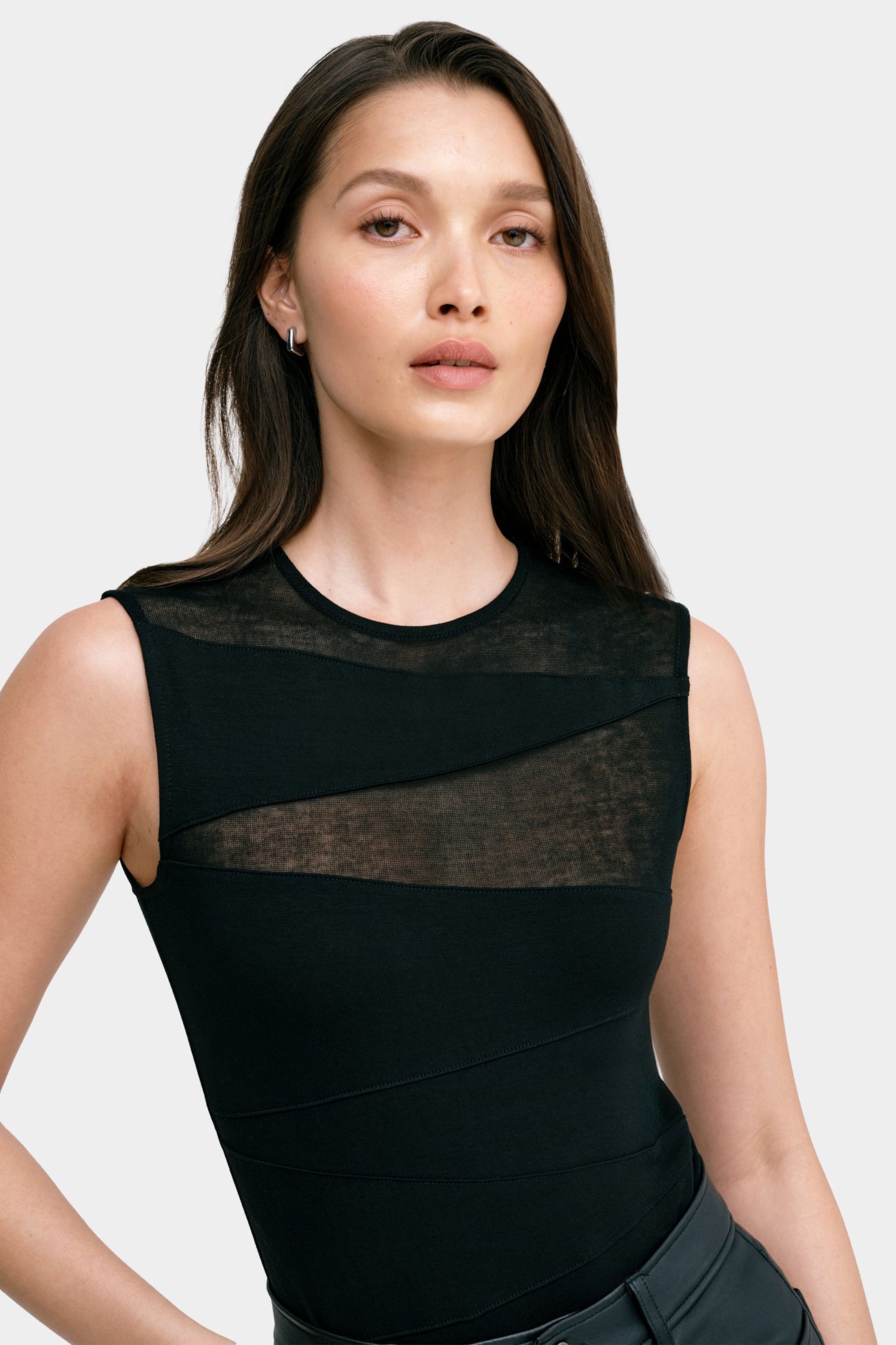 Meet the Aaliyah Bodysuit, our body-hugging essential with a stunning geometry-inspired silhouette. Beginning with her round neckline, Aaliyah features alternating swathes of opaque and sheer European jersey to create contrasting triangular shapes. Perfect for dressing up or down and offering a body-hugging fit, Aaliyah will add a unique touch to any of your looks.