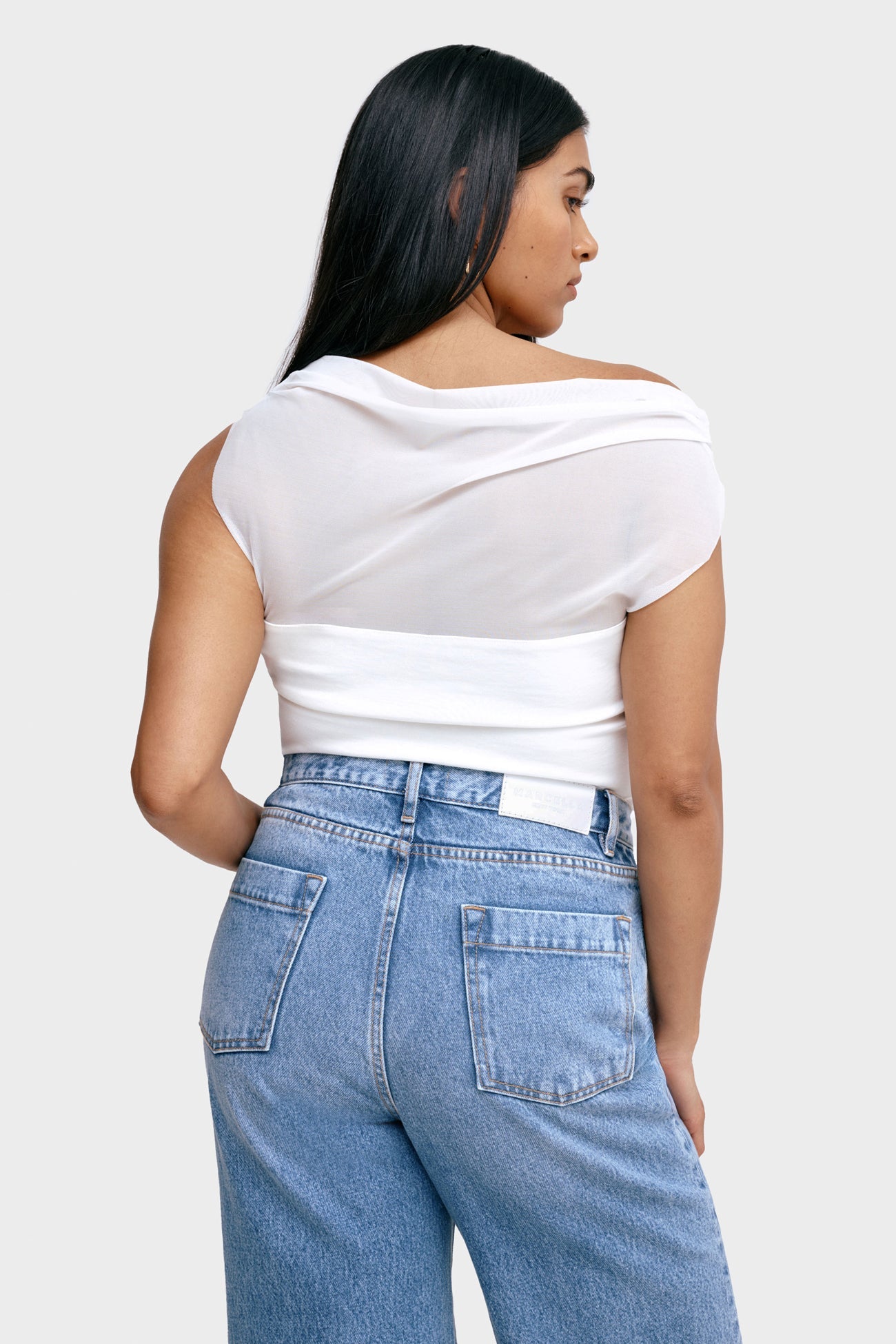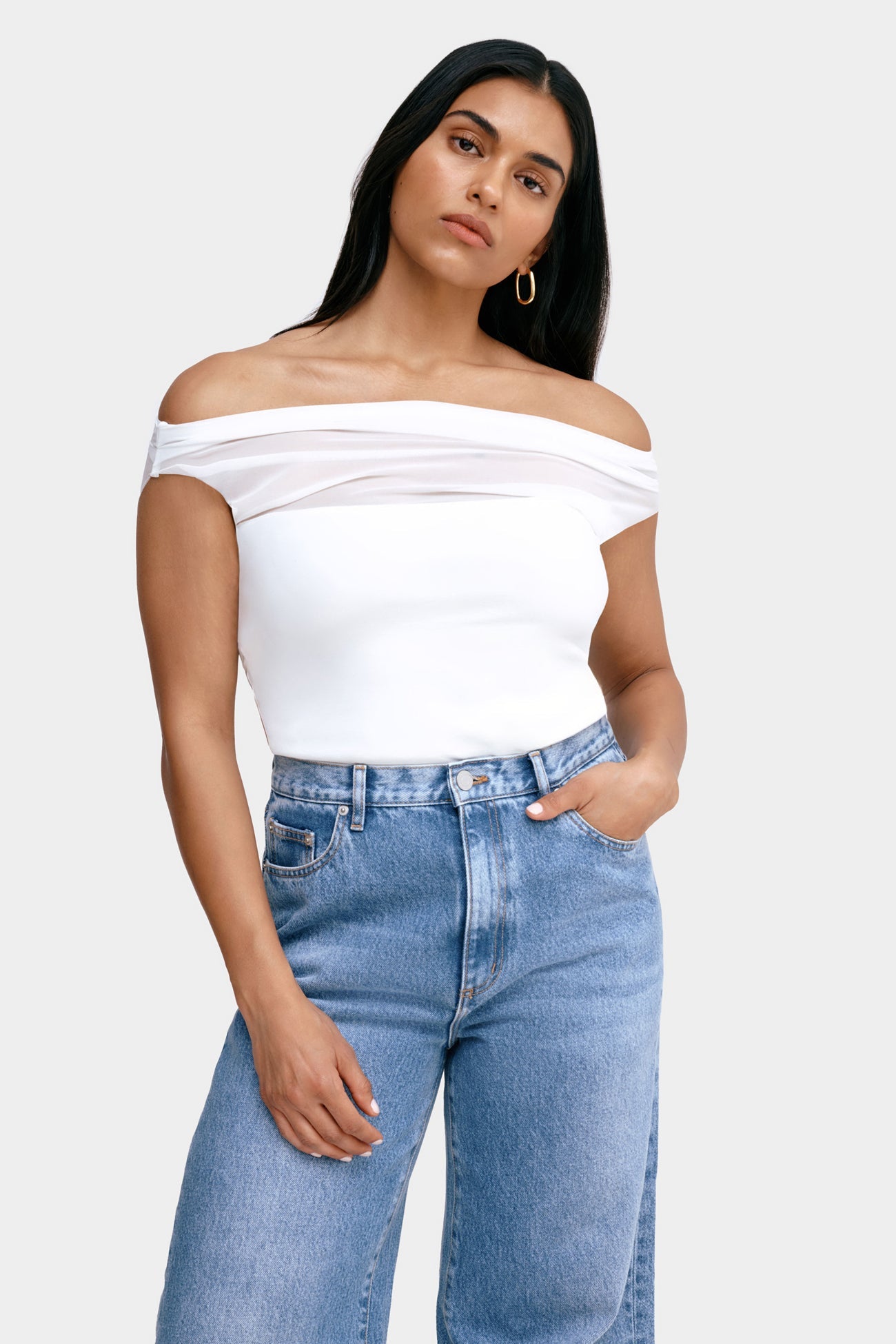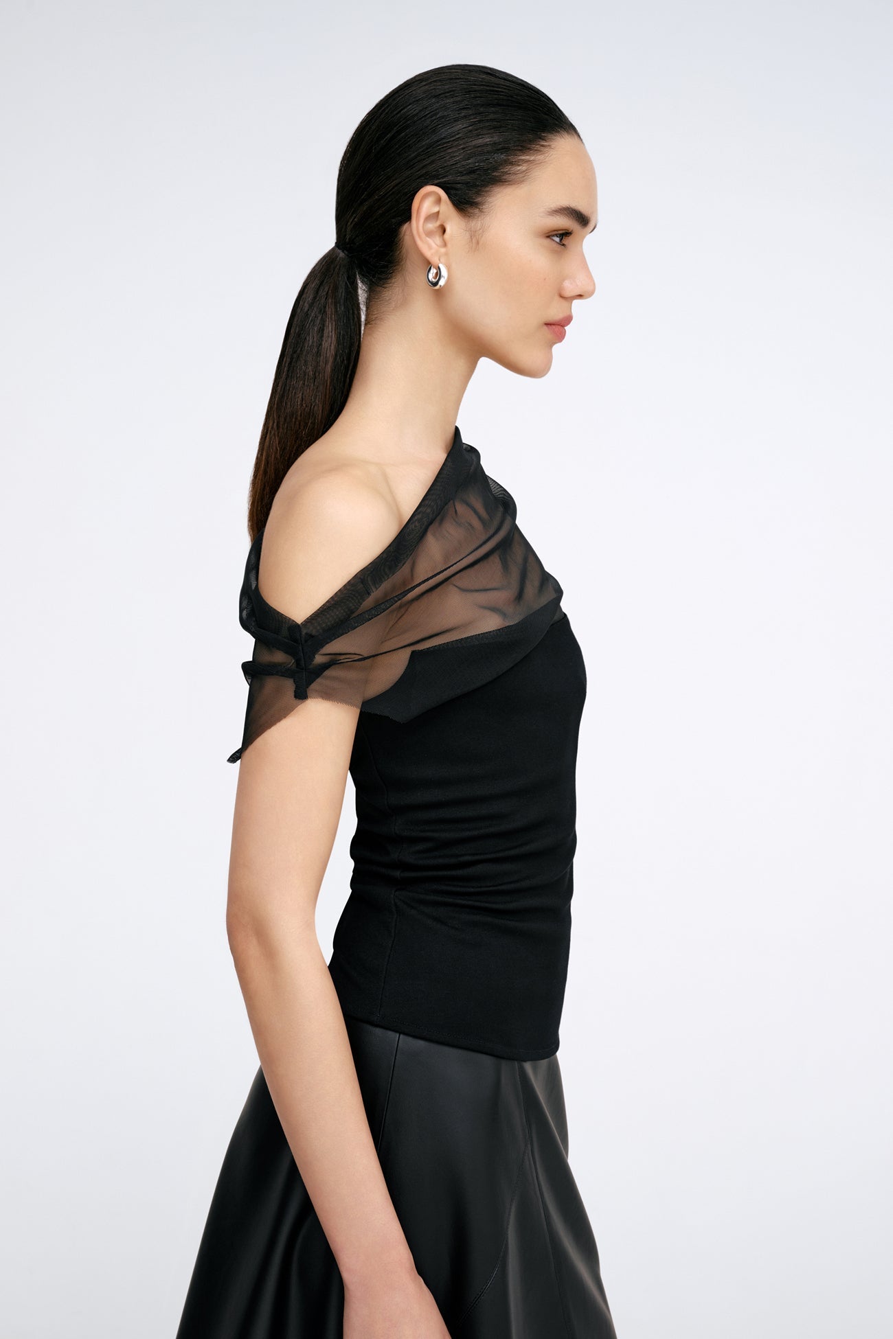 Let our Cabrini Top whisk you away to effortless elegance. Her structured European ponte bodice is crowned by a gathered soft mesh panel that you can transform to your liking—pull it up to create a high neck silhouette, wear it on or off your shoulders or style her draped off one shoulder for artful asymmetry. Raw edges on Cabrini's mesh offer an element of texture to balance her polished form.