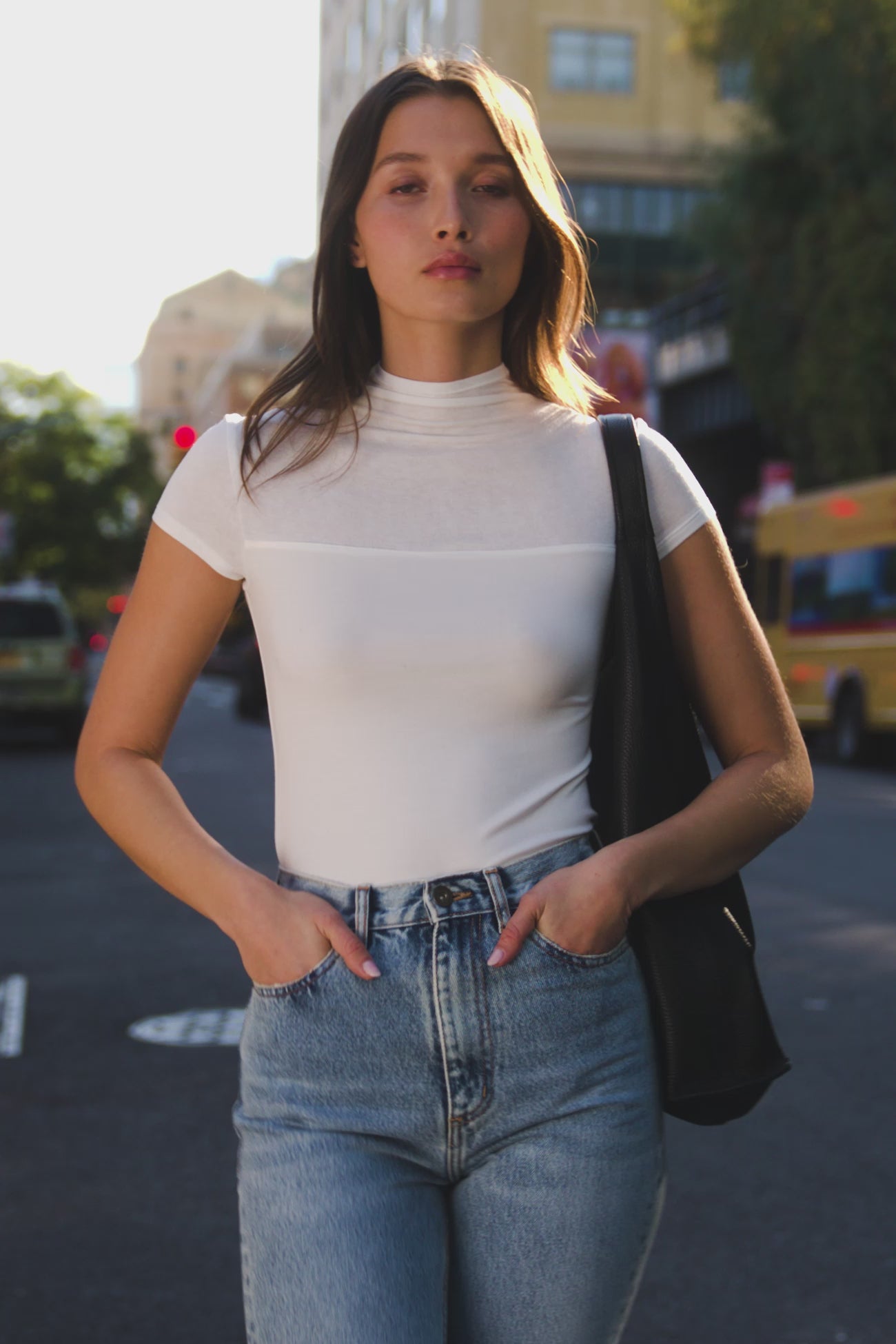 The perfect versatile top with edge, our Darcey combines a soft, high-stretch and sustainable European jersey body with a sheer European jersey mock neck and sleeves. Her ultra-comfortable, body-hugging fit makes pairing Darcey with your favorite pants or skirts easy, whether you're getting dressed for a night out or for brunch the next day.