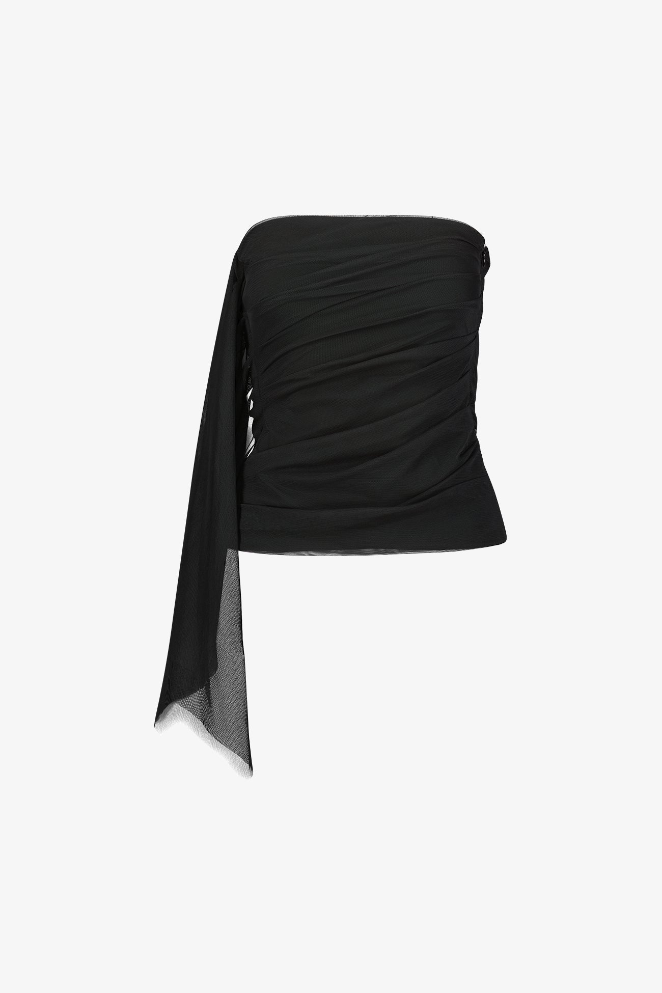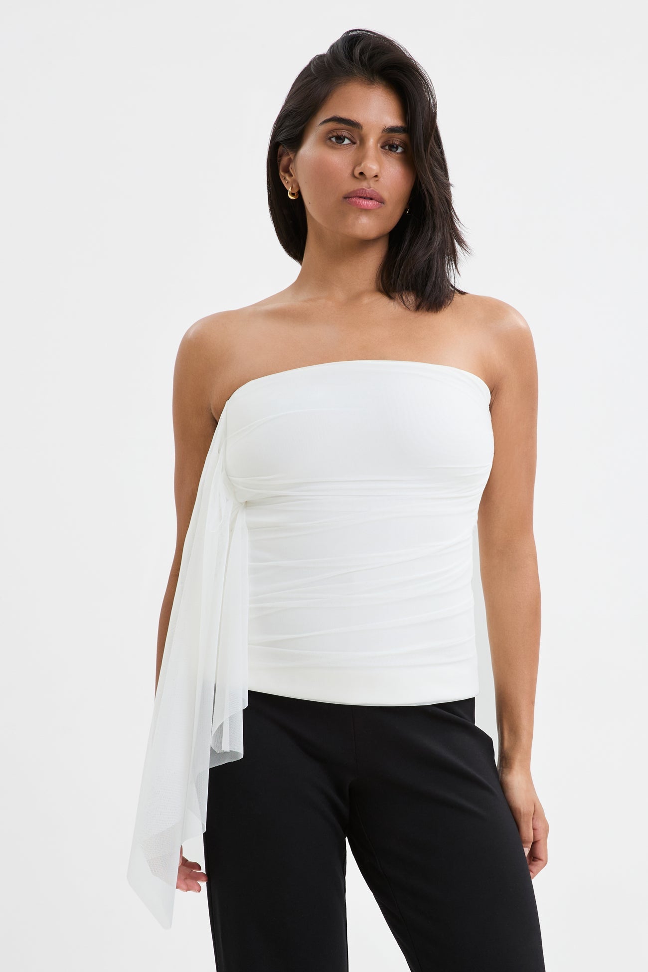 This cocktail essential puts the Drea in dreamy. This European ponte tube top features a soft, gathered mesh overlay and a dramatic raw-hem mesh drape that floats freely at one side. Lined in soft mesh with a silicone elastic band at the bust for a secure fit, she's complete with a hidden side zip and hook-and-eye closure.
