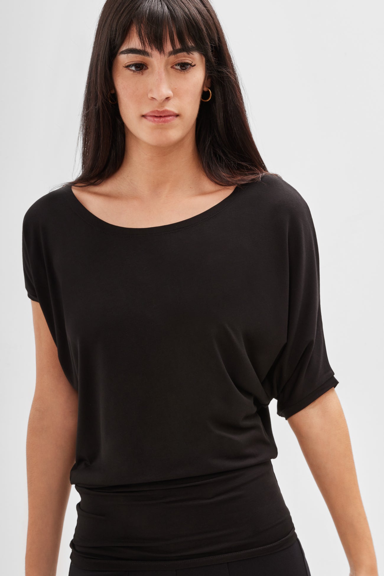 If you're in the mood to lounge luxuriously, Elena is the move. Fashioned from silky soft, eco-friendly European jersey, our all-day/all-night top features a loose scoop neck and asymmetric sleeves with a batwing on one side. Her oversized silhouette tapers below the waist for a flattering fit. Elena's versatile enough for professional or casual looks.
