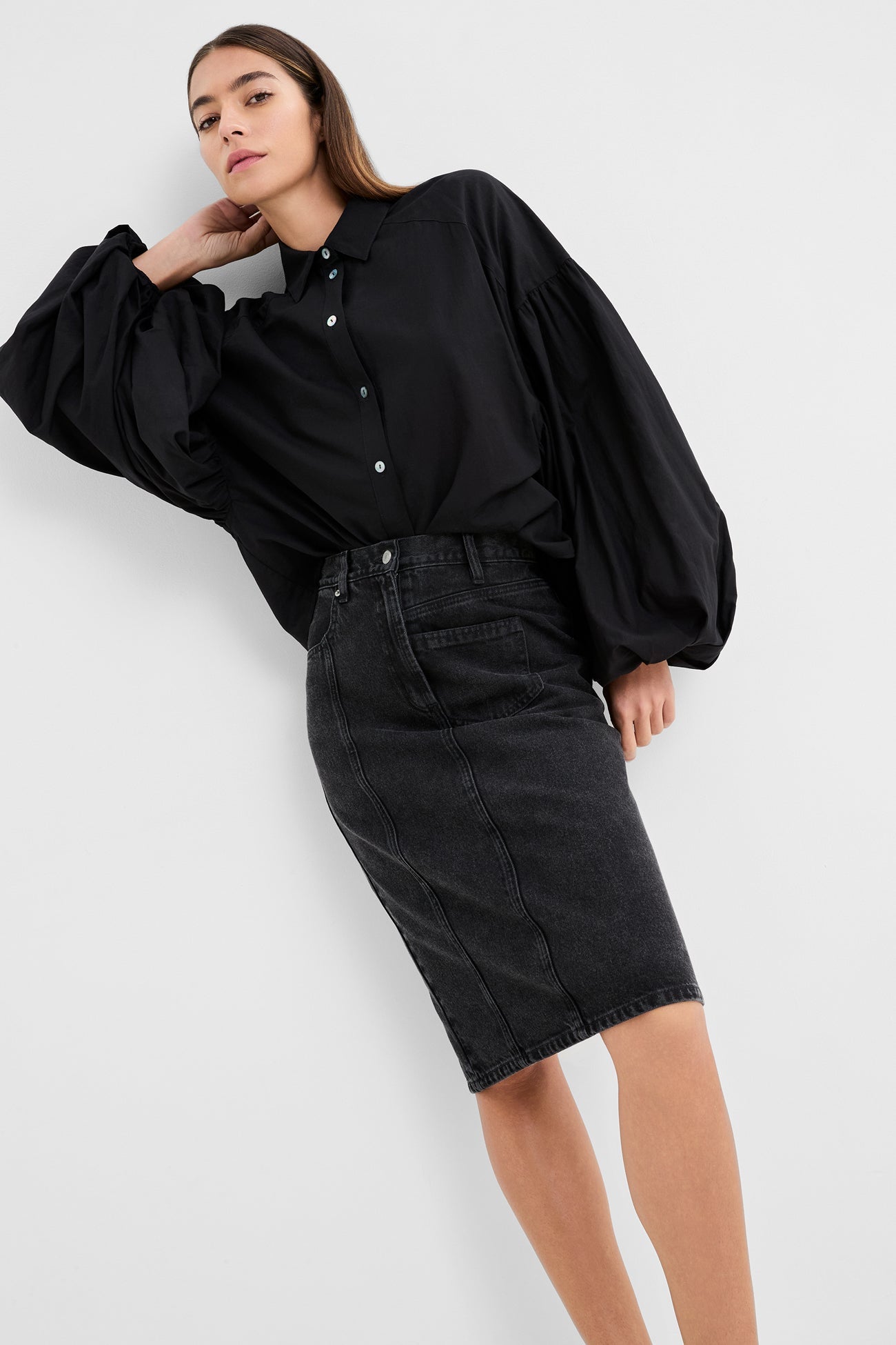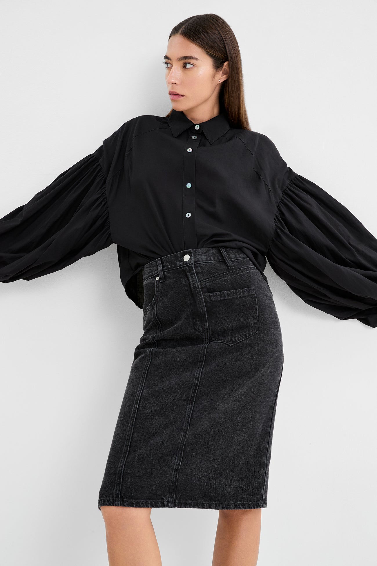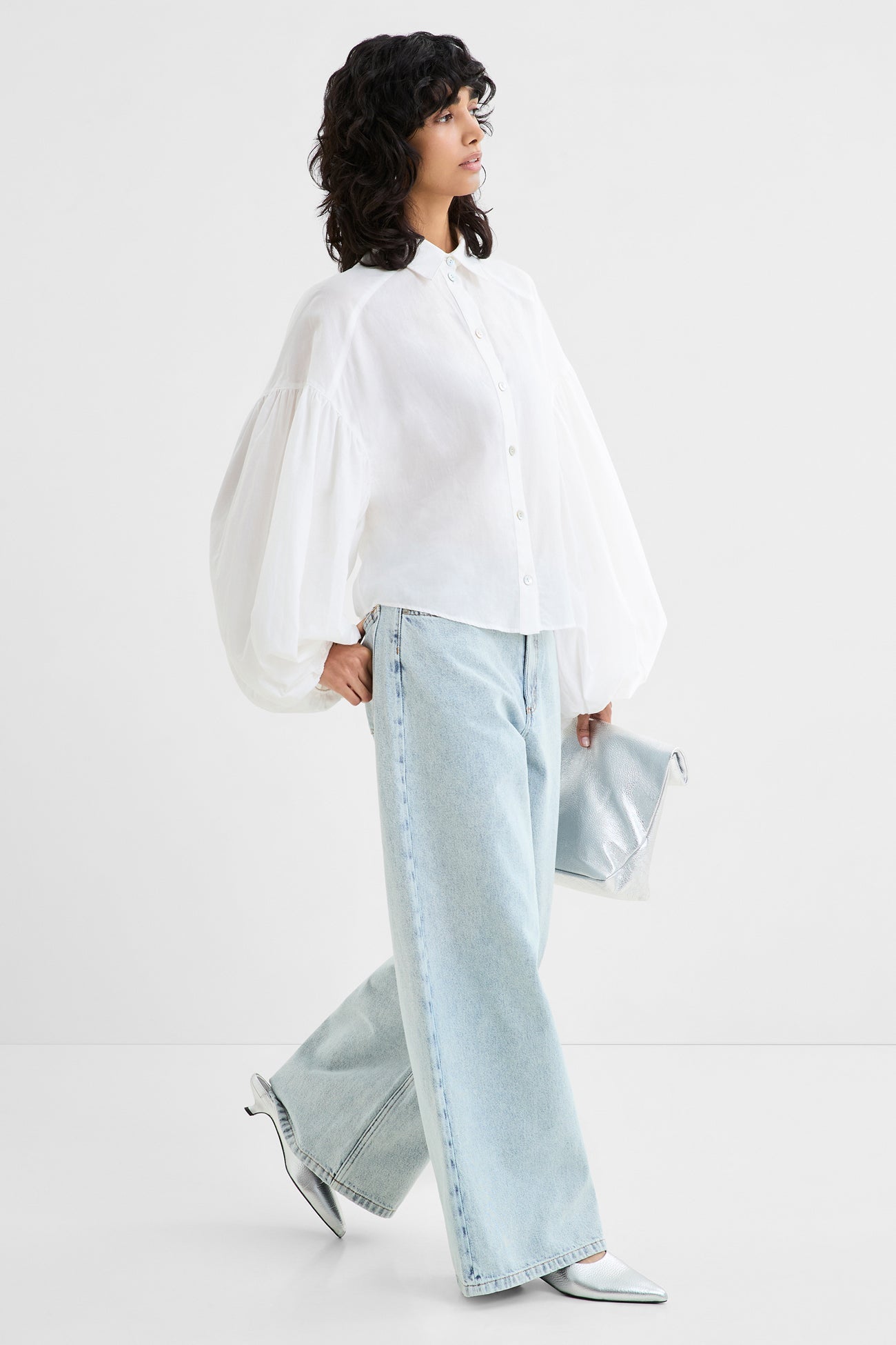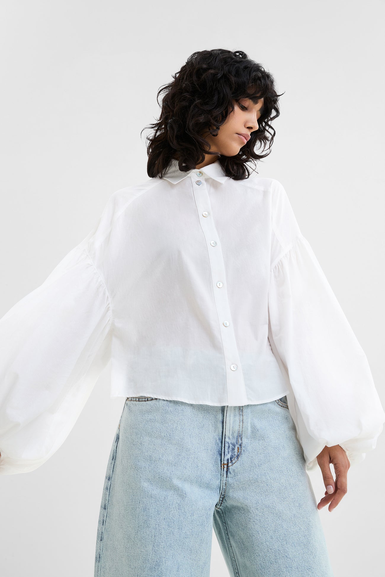 From her volume to her classic shirting details, Fulton delivers polished drama. Our contemporary button-down in lightweight, semi-sheer European cotton voile features a relaxed yet structured silhouette, pairing statement bishop sleeves with a sharp collar and pearl-effect buttons. She's crisp and comfy from desk to drinks.