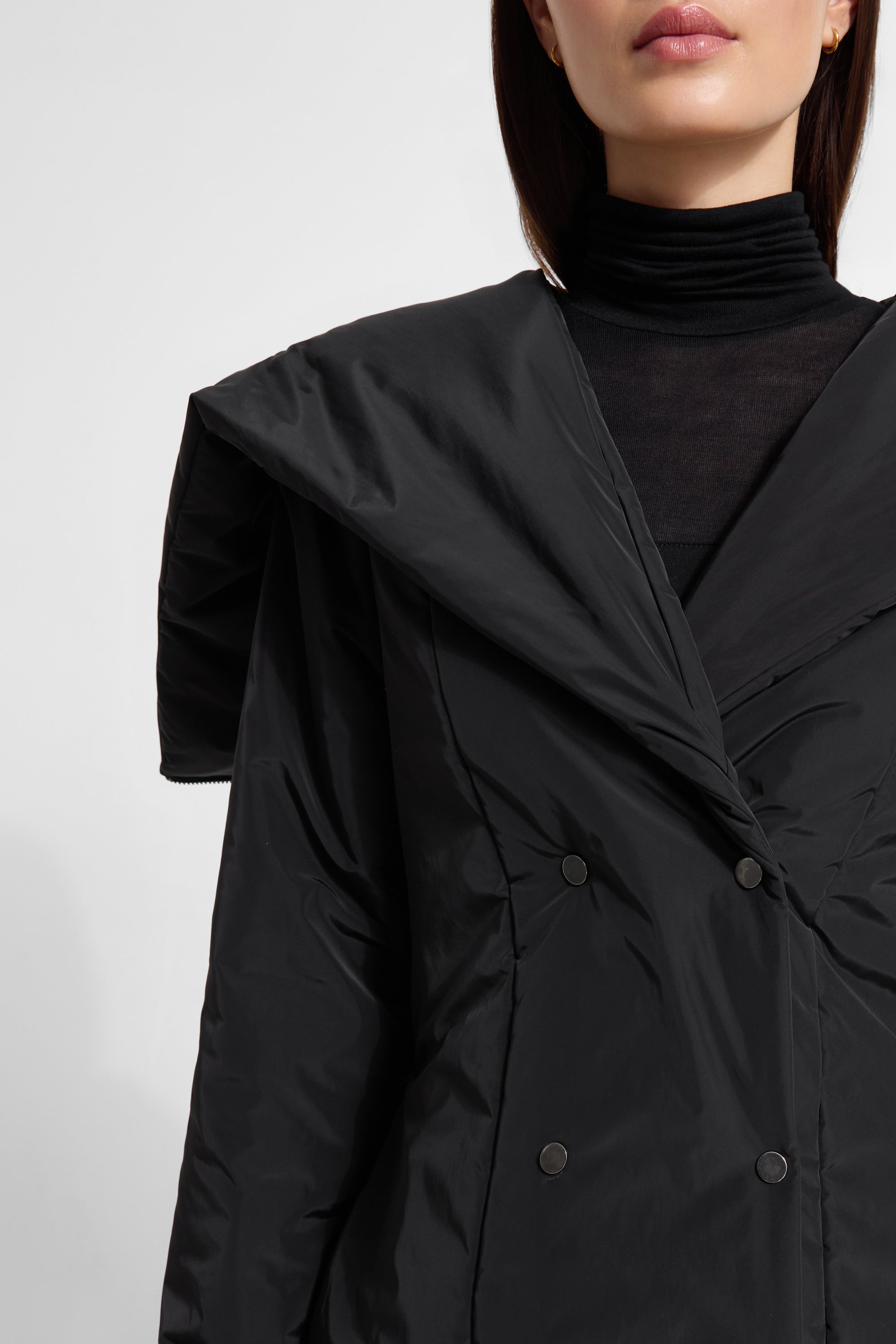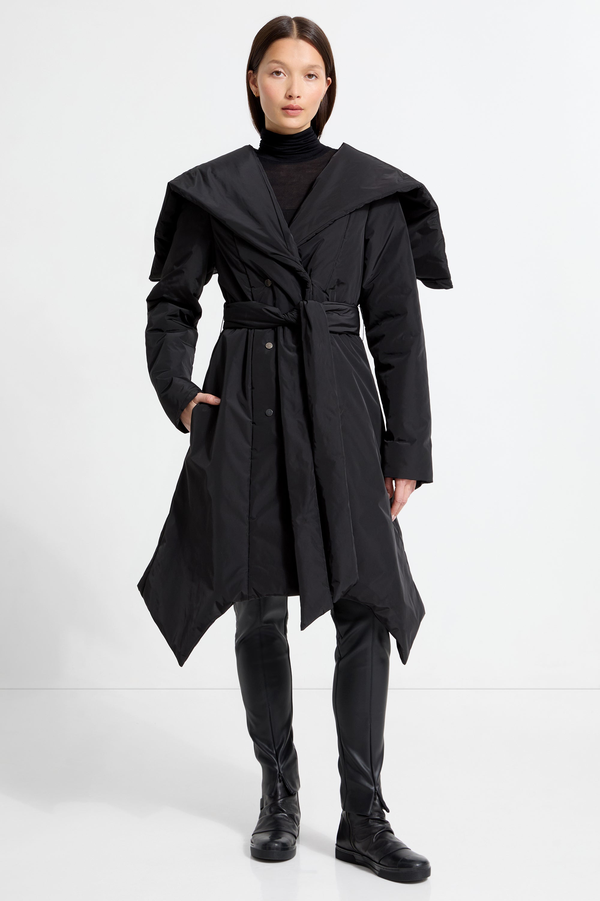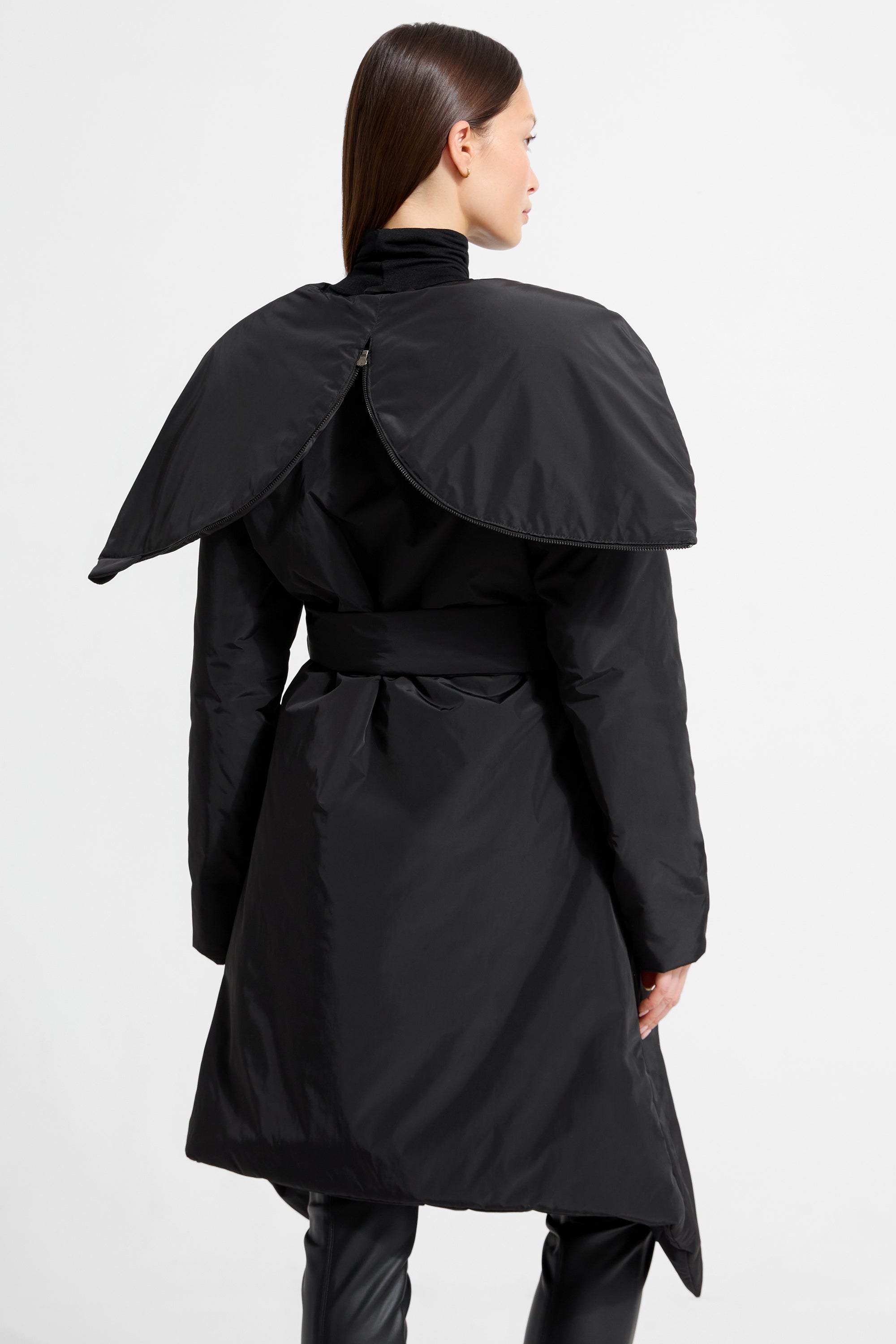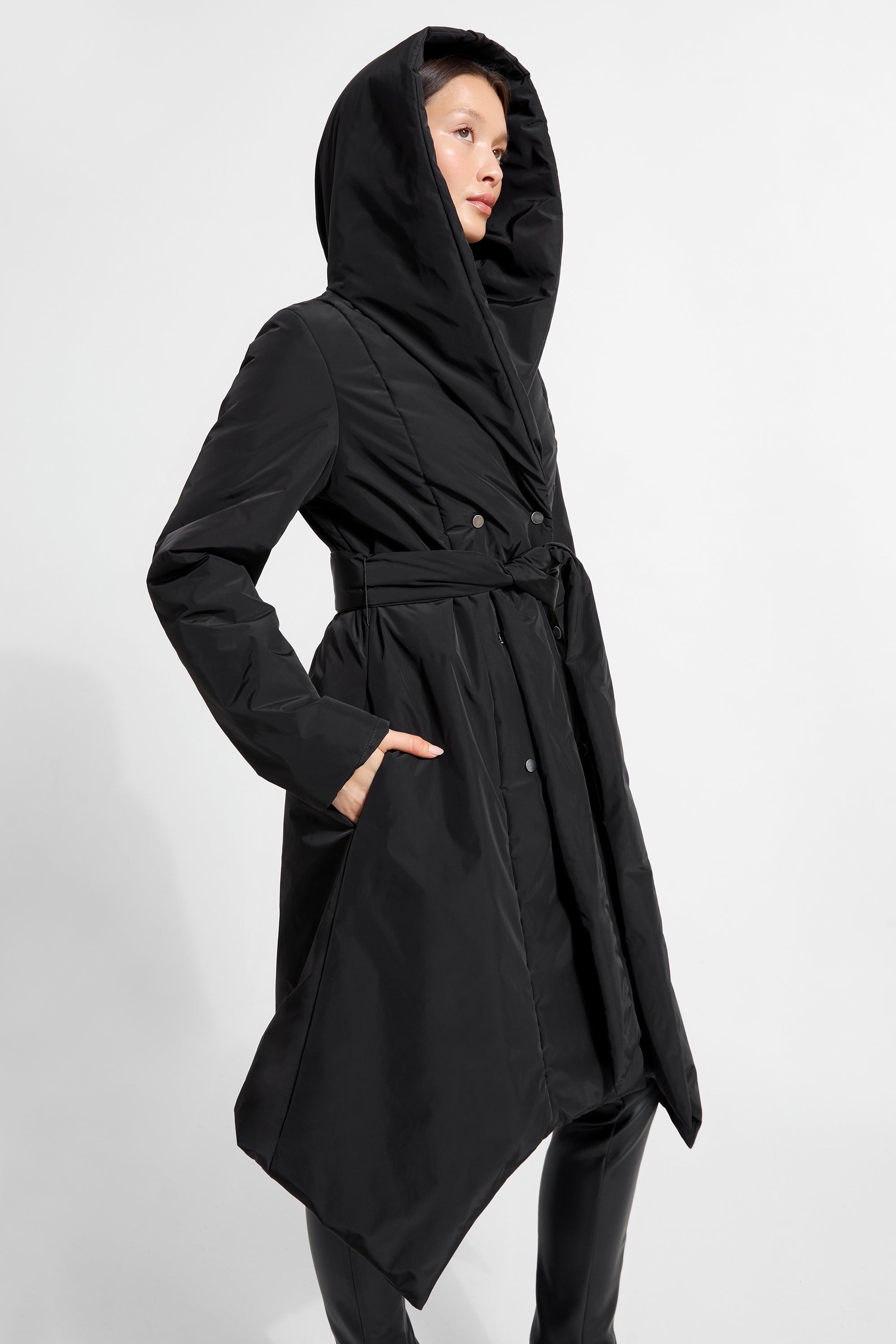 Jess is no ordinary puffer coat. This modern style showcases an asymmetric handkerchief hem, and a hood that crowns the head with oversized drama—or unzips into a foldover statement collar, depending on your mood. Crafted from smooth, resilient European polyester puffer jacket fabric with cozy added batting, she’s shaped by ribbed cuffs, princess seams, and a belted waist, while functional pockets and a metal snap fastening complete the design.