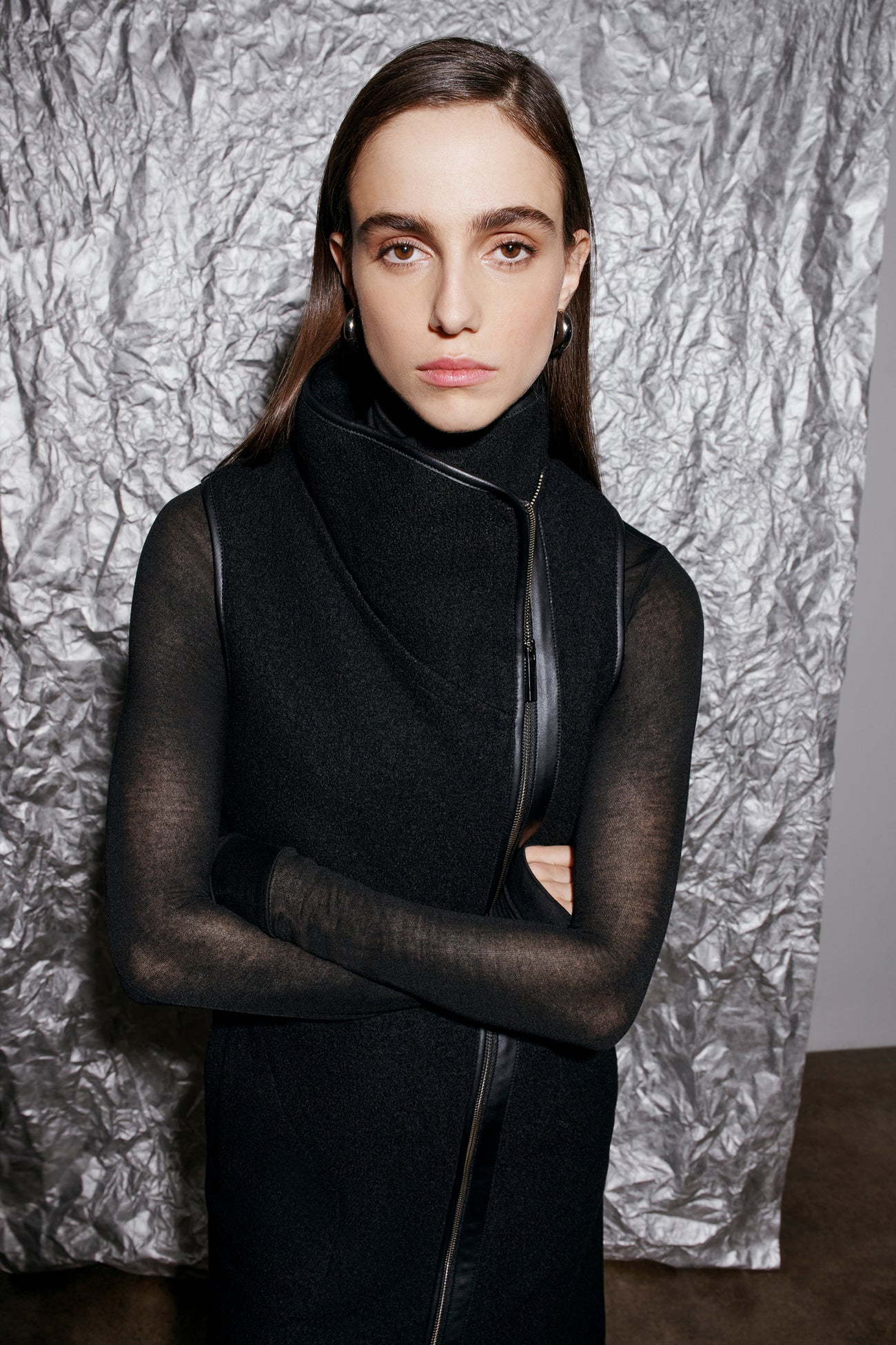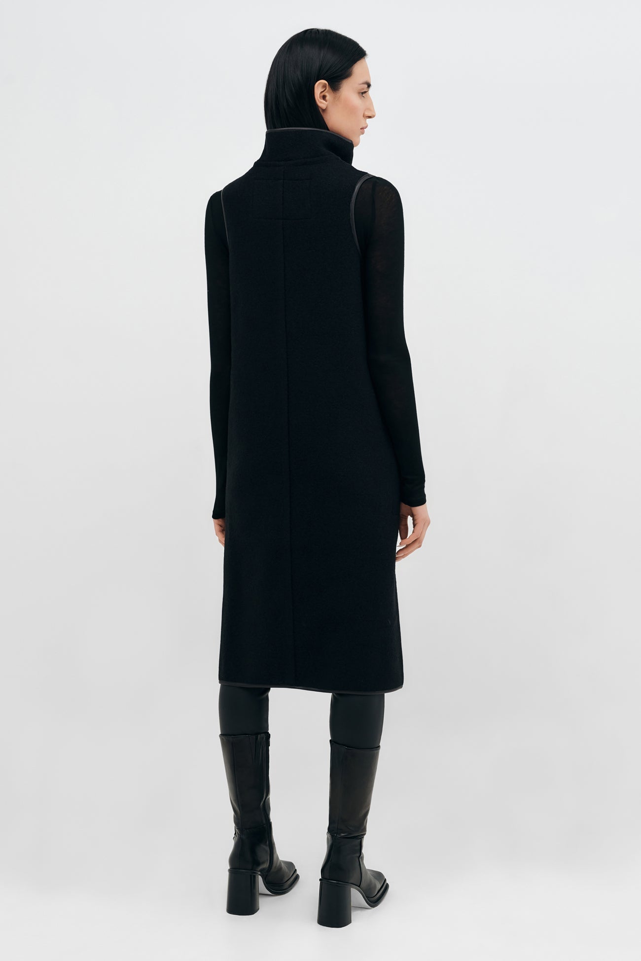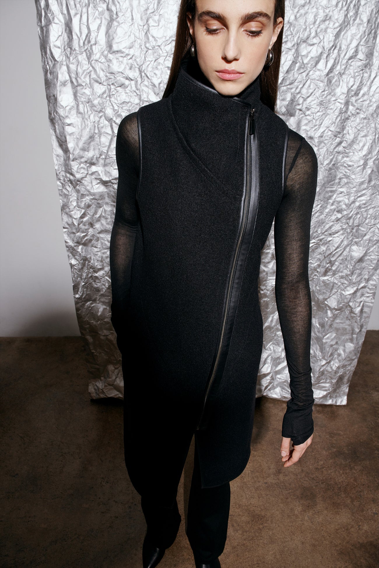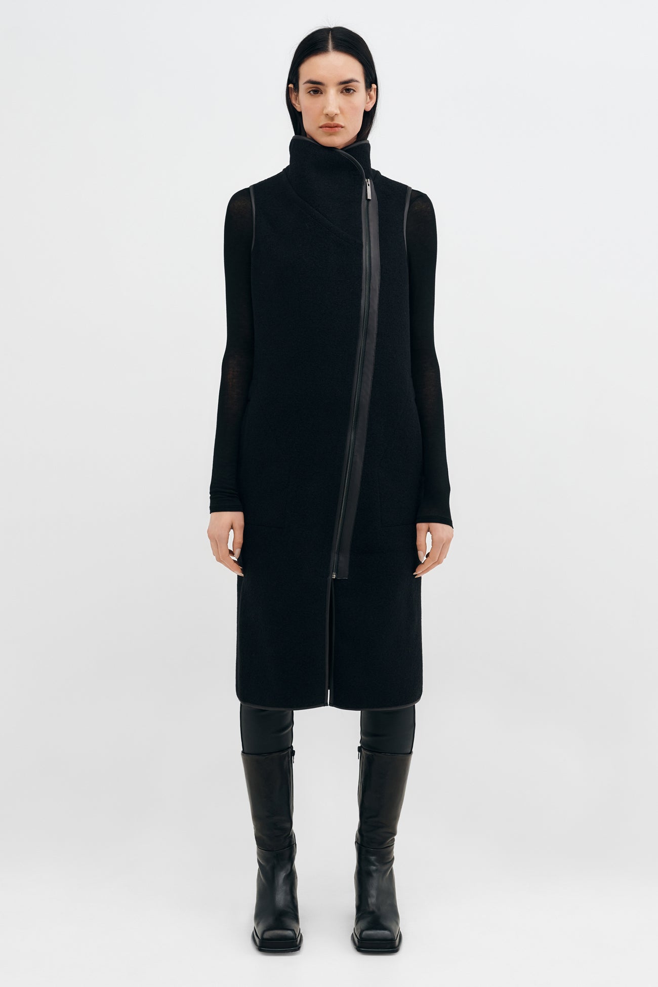 Wool meets effortless cool with our Kendra Vest. Crafted in 100% soft Italian virgin wool with vegan leather trims, this knee-length vest brings polished drama with its high collar and asymmetric zip. A sharp front slit and sleek welt pockets seal the deal. Wear her once, and you'll never want to go without.