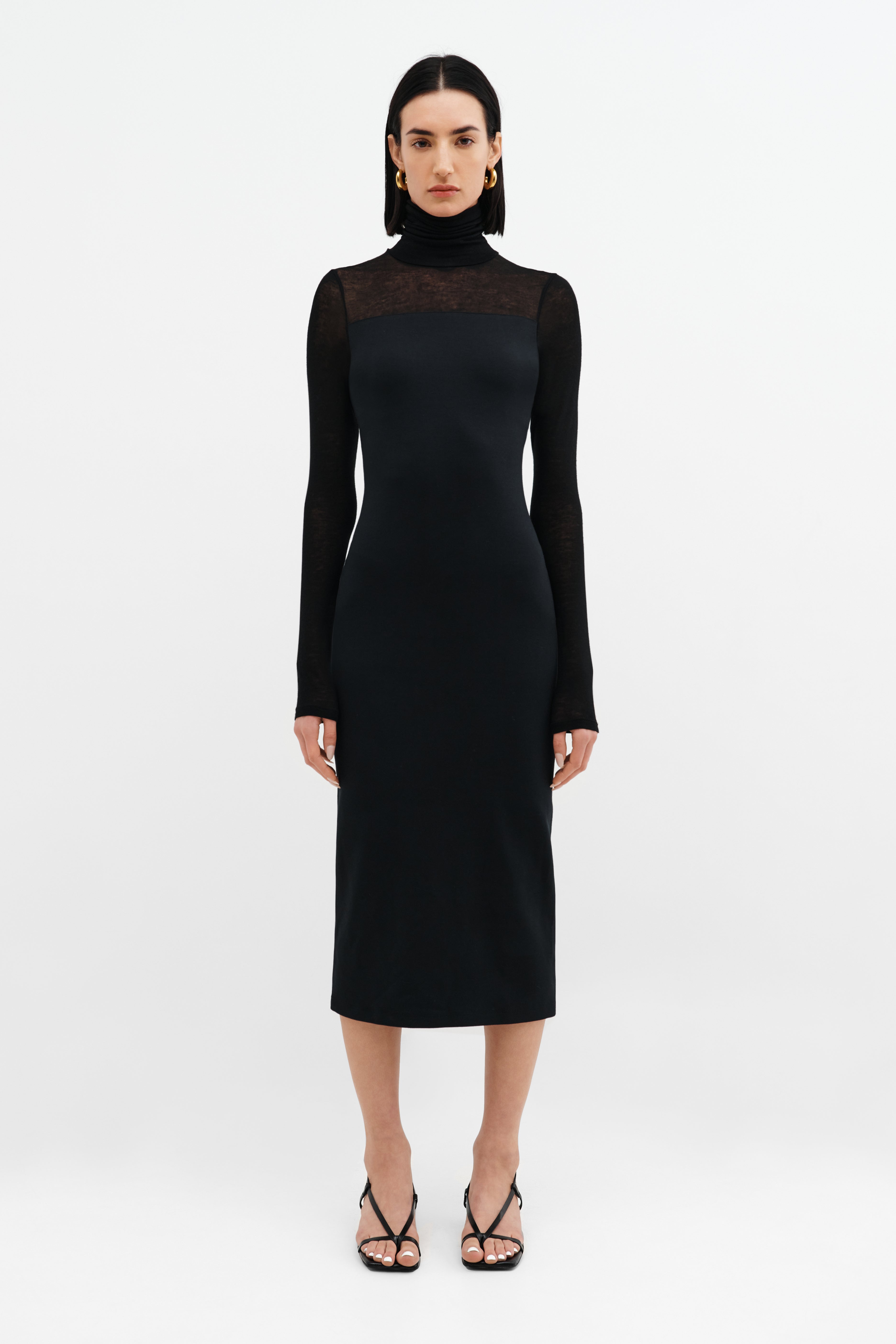 Beautiful simplicity. Mainly fashioned from our structured, mid-stretch European ponte, our Marina is an elegant but subtly arresting black midi dress with a turtleneck, neckline and extra long sleeves in silky sheer European jersey. Offering a body hugging fit, Marina works for any setting. We recommend wearing her with a strapless bra.