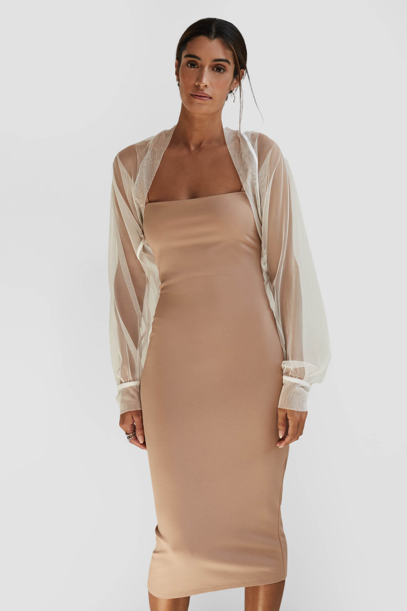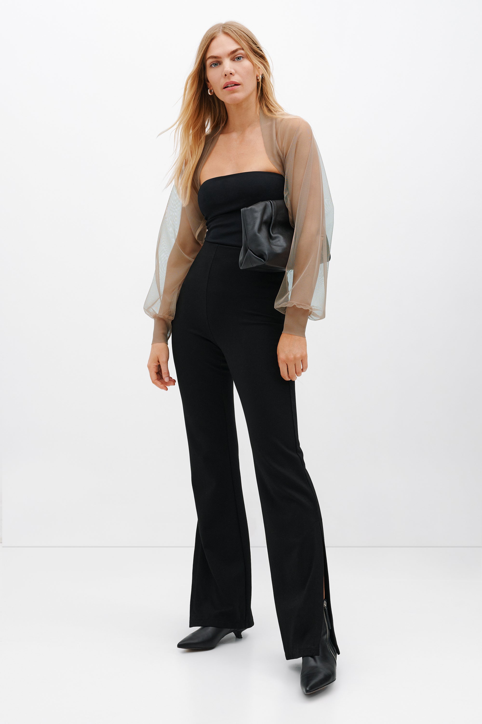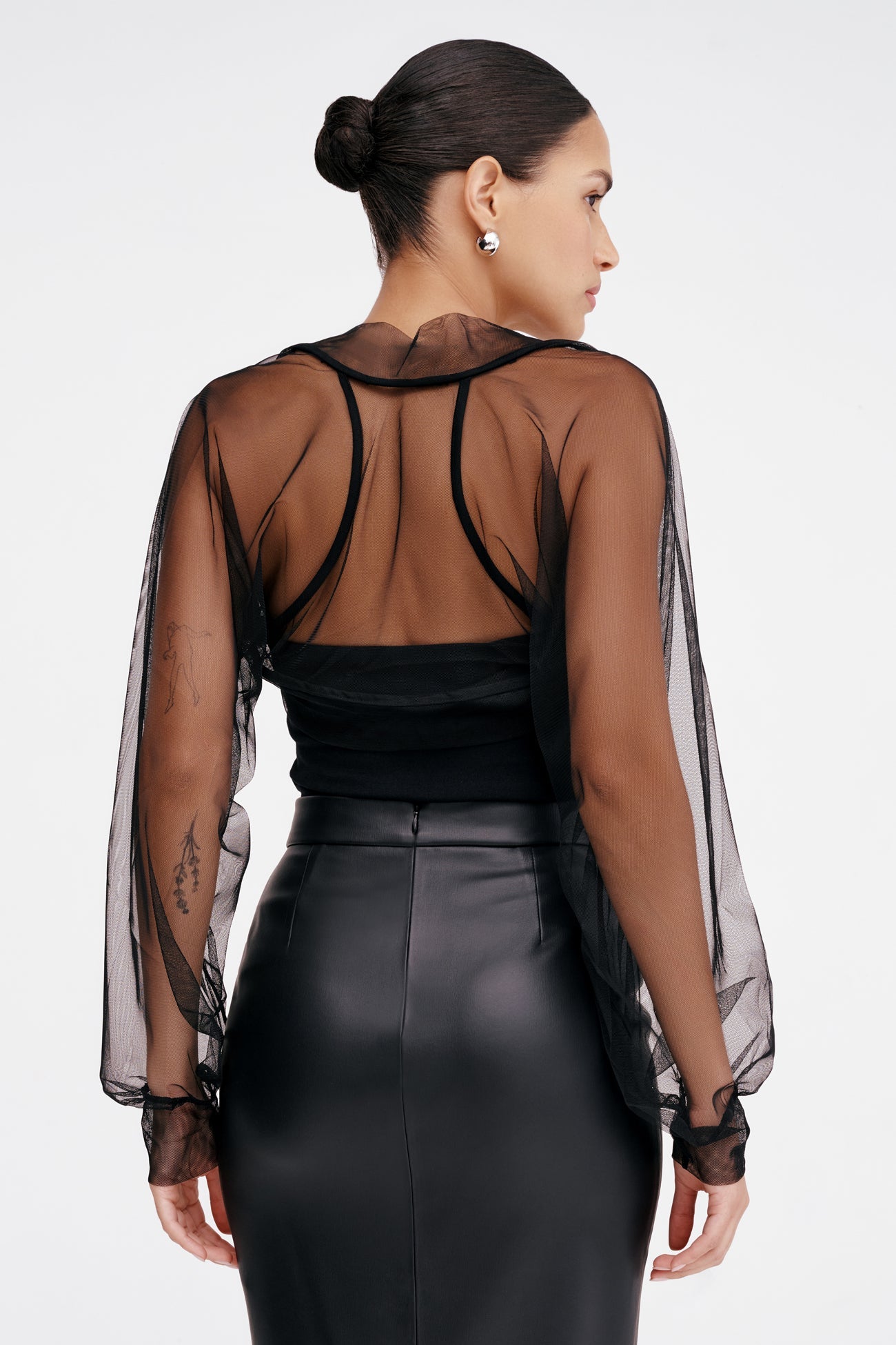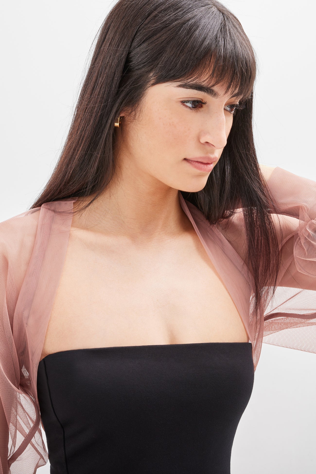 Light and airy, soft against the skin, our Olympia Bolero is a sheer bolero of pure glamour. Fashioned from premium mesh, her Juliette sleeves gather to a fitted cuff for a truly romantic silhouette, while accent seams in the back add an edgy elegance to officially go with everything in your closet. This mesh bolero shrug’s THE piece to take your night-out outfit to the next level.