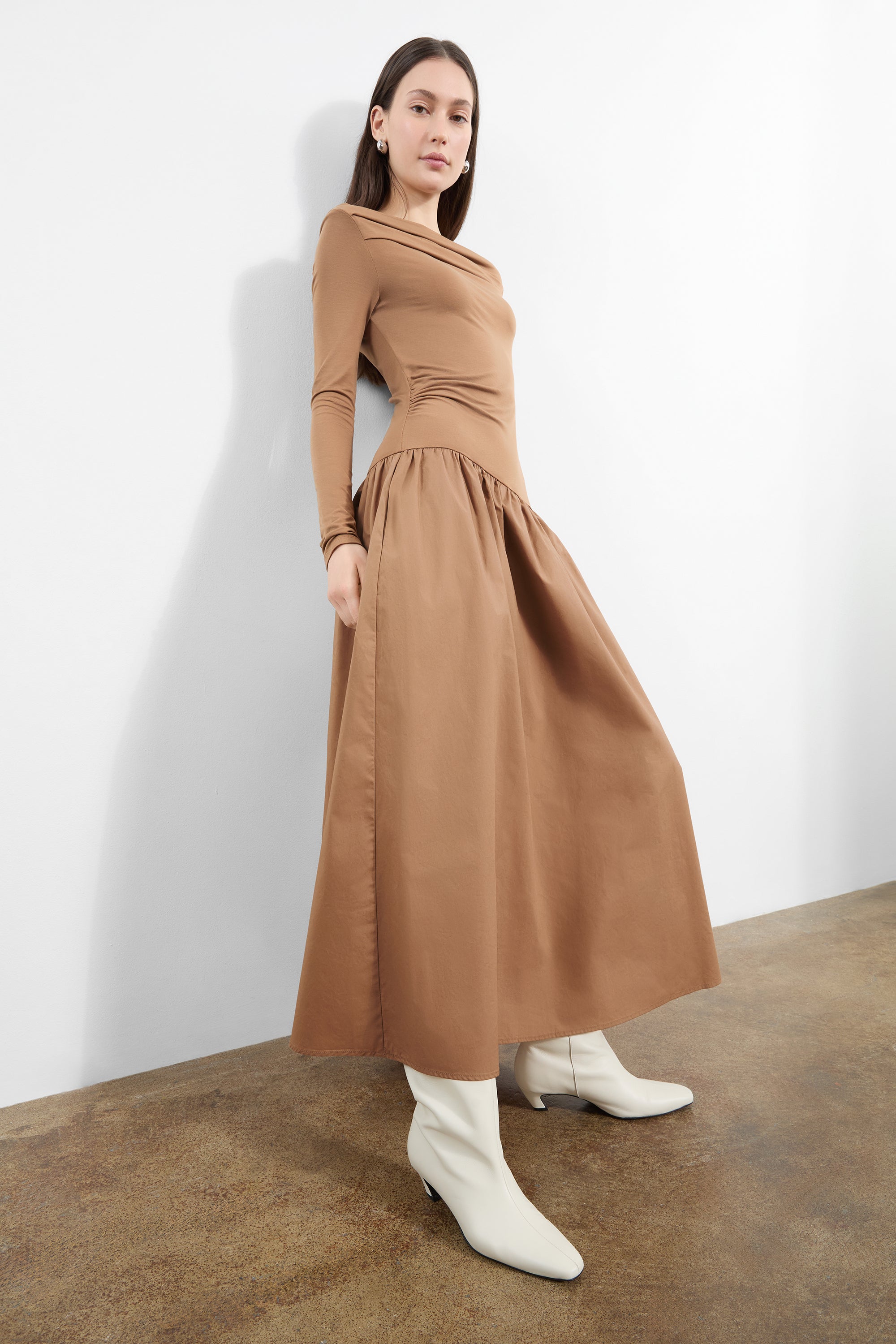 Winslet is the classic silhouette that dresses up or down effortlessly. Inspired by our best-selling Cooper Top, this long-sleeved A-line dress flatters your figure with a shoulder-framing boat neckline and gathered bodice in high-stretch, sustainable European jersey. Flaring into a dropped-waist skirt in 100% European poplin cotton, Winslet exudes grace with every move you make.